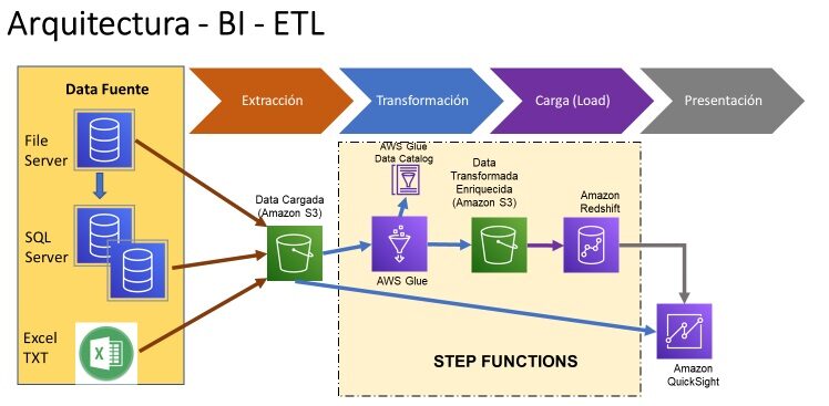 Hemos implementado soluciones de BI, construyendo flujos de ETL con las herramientas de AWS tales como Glue, S3, Step Functions, usando la Base de datos Redshift y la herramienta de presentación de QuickSight